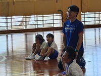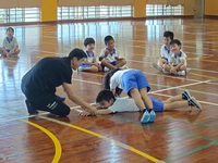 昨年度から、日本の離島地域における体育の授業の実践について研究している國學院大學の大矢隆二教授とお母さんといっしょの新しい体操「からだ☆ダンダン」監修の巣立隆宏先生が来校し、2年生と3年生の体育の授業を行いました。