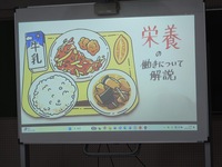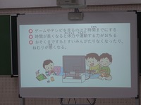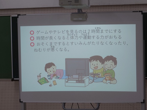 赤・青・黄色の食べ物の栄養素についてビデオで大切さを教え、バランスの良い食事を取ることの大切さや、小学生には生活リズムが大事なこと等を教えてくれました。またスマホはなるべく見ない方が良いですね。ともお話しし、長時間のスマホやゲームは体に悪いことも話されました。