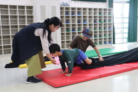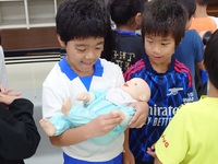 その後、約3キロをおなかに抱える妊婦さんの体験、産道を通って生まれてくる疑似体験を行いました。
