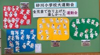 たのしく盛り上がった運動会から、もう10日間が過ぎました。子ども達は、縦割り班ごとに運動会のふり返りを正面玄関に掲示してあります。