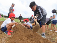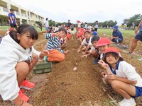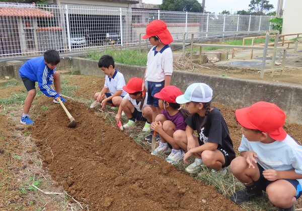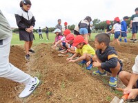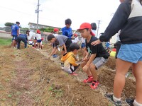 本日、農園で全校児童による縦割り班活動の野菜の植え付けを行いました。1年生から6年生までの縦割り班で、ジャガイモやタマネギなどを植え付けました。