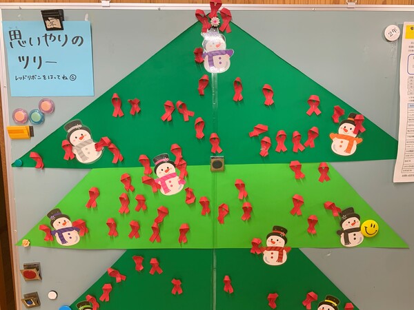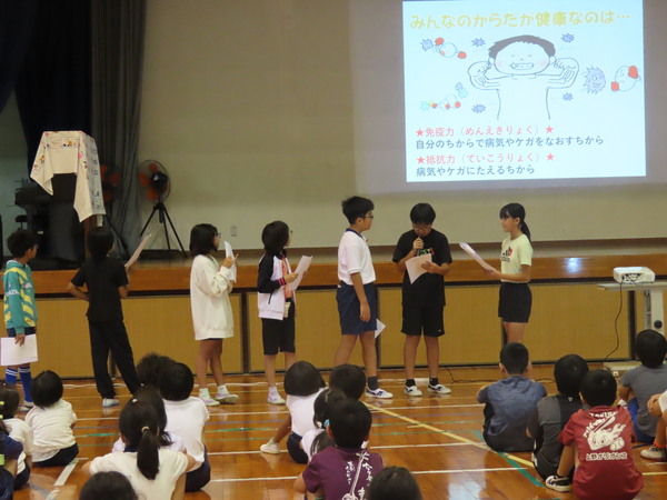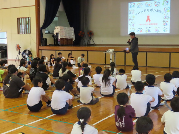 集会では、保健委員会からエイズの概要、体の抵抗力に関する説明、そしてレッドリボン運動についての説明が行われました。児童・職員は左胸にレッドリボンを着用し、人権を考える週間の取り組みの一つとして、集会に臨みました。