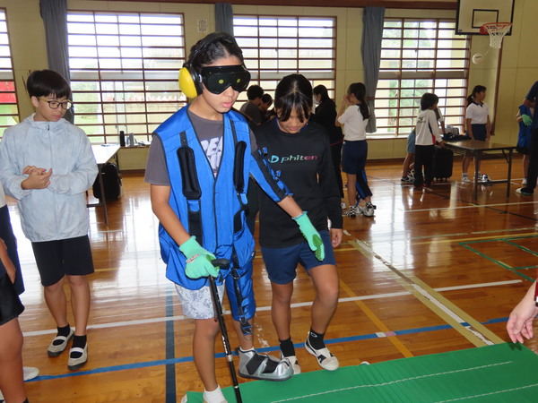 体験では、手首、足、体におもりを装着して体の動きを制限し、細かい作業がしにくい特殊な手袋をはめ、ゴーグルで視界不良を、ヘッドホンで音の遮断を再現しました。