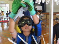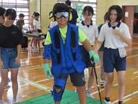 その後、高齢者疑似体験のスタートです。装着物の確認とともに、動きが大きく制限されるため、転倒などの危険があることから、ふざけたり、押したりしないよう指導がありました。