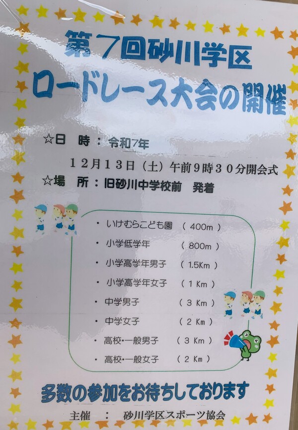 来る12月13日(土)、歴史文化資料館(旧砂川中学校)にて、砂川学区スポーツ協会主催の「第7回 砂川学区ロードレース大会」が開催されます。