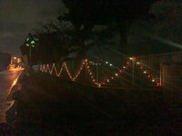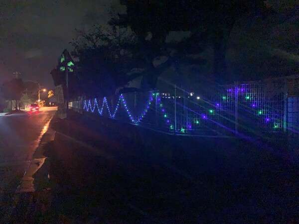 今週、県道に面した南門のフェンスに、イルミネーションを取り付けました。 これは子ども達が企画して設置したものです。昼間は目立ちませんが、夜になると鮮やかに点灯し、通りを彩っています。