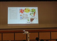 発表では、学校給食の始まりや昔と今の給食の比較、城辺(ぐすくべ)学校給食調理場の紹介、栄養士さんの給食作りへの思いなどが紹介されました。 また、献立表にある「三色食品群」についても説明があり、「赤:血や肉や骨をつくる食品」「黄:働く力や体温となる食品」「緑:体の調子を整える食品」の働きを詳しく知ることができました。