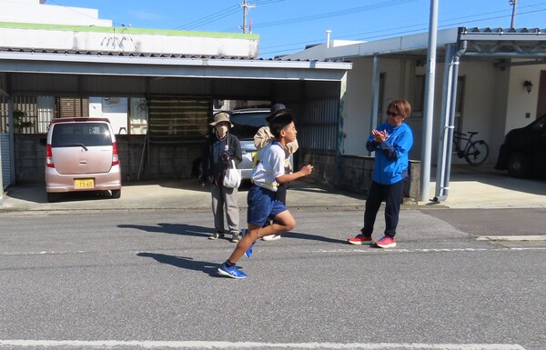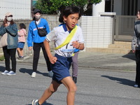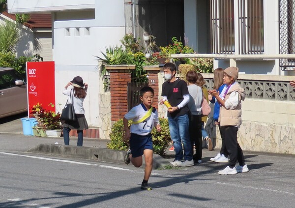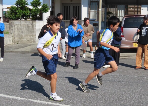 レースは、1区のエース田中選手が好位置でタスキをつなぎ、チームを活気づけました。続く2区の国吉選手は、チームで唯一の4分台(1.2㎞区間)の快走。その流れに乗り、3区友利選手・4区友利選手がともに「5分03秒」という自己新記録で粘り強くつなぎました。 順位を落としつつも、アンカーを務めた6年生の久貝選手も最後まで粘りの走りを見せ、フィニッシュテープを切りました。