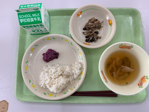 ※写真のメニューは、ある日の6年生と1年生の給食です。学年によって給食の量がちがうのが分かりますね。