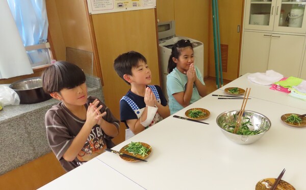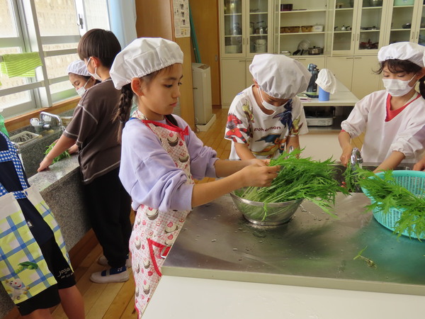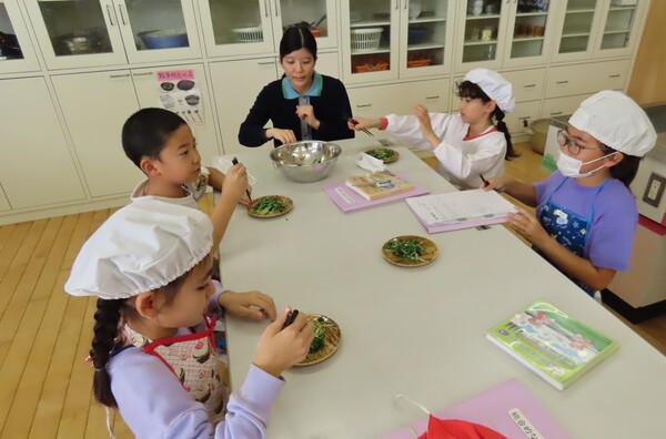 栽培園でみずみずしく成長した水菜を、友達と協力して収穫。その後、家庭科室に移動して調理に取り組みました。今回は火を使わずに工夫してサラダを作りましたが、実は事前に教室で「どのメニューがいいか」をプレゼンし合い、みんなが納得して決まった一品だそうです。子ども達の学びの深まりが伝わってきますね。