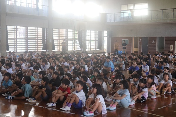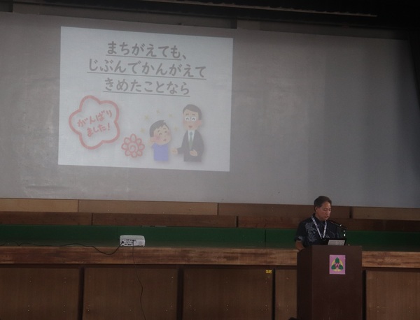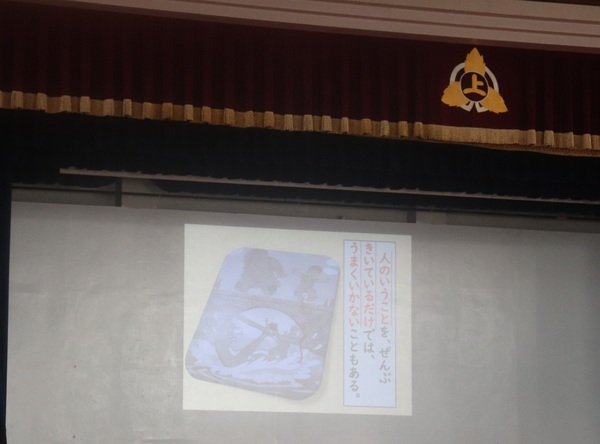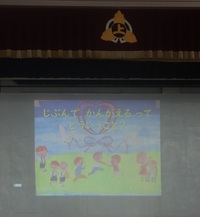 全校朝会で、校長先生が「じぶんでかんがえるって どういうこと」と題して、講話をしました。
