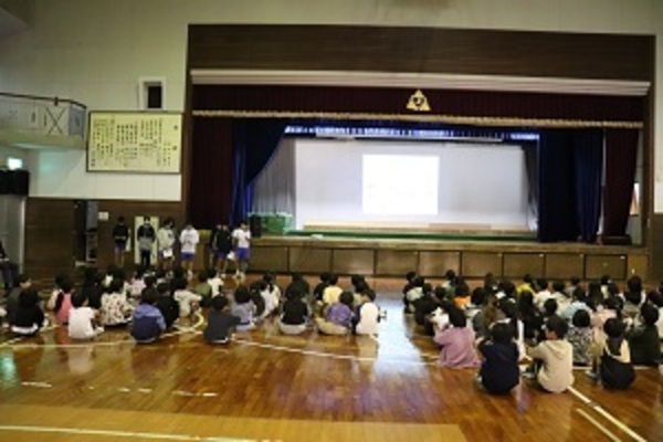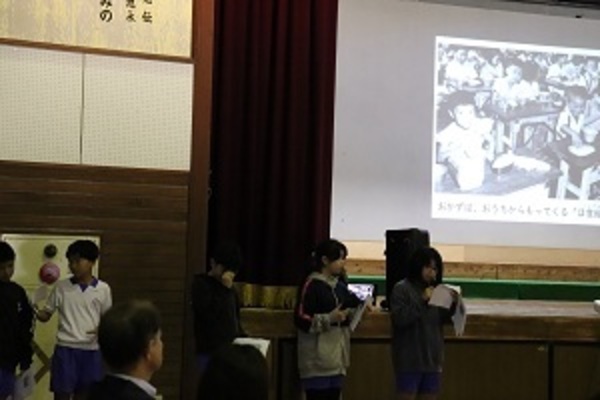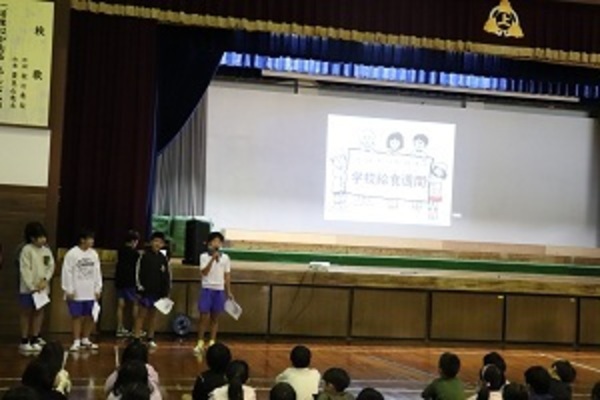 給食週間にちなんで、給食委員会が朝会で、給食週間の取組や給食の歴史等を発表しました。