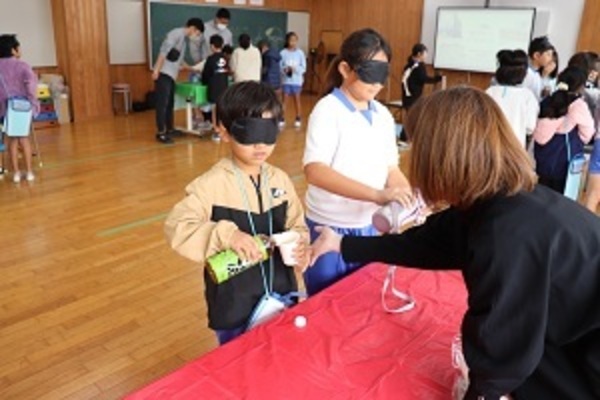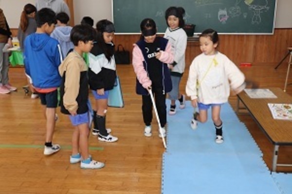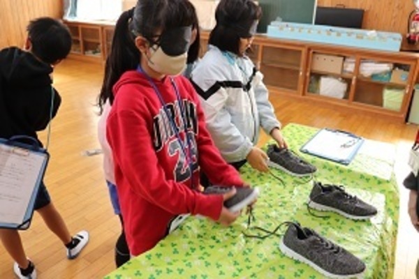 社会福祉協議会の職員の方を招いて、「福祉体験(アイマスク)」を行いました。視覚障害のある方の気持ちになって体験したり、身近にあるユニバーサルデザインについて考えを深めたりしていました。