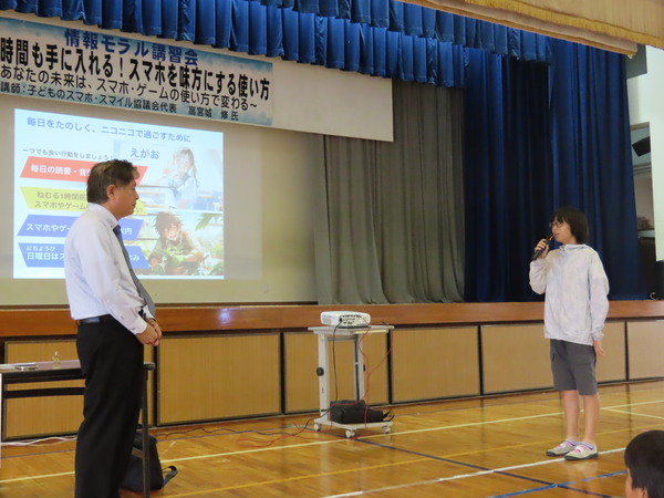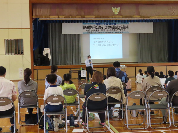 昨日、5校時の授業参観後に、高宮城 修先生を講師にお招きし、4~6年生と保護者・職員計70名で情報モラル講習会を実施しました。